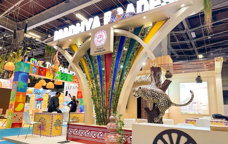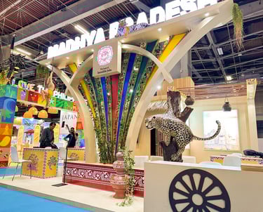 Showcasing the Wild Heart of Madhya Pradesh in Paris — our custom-built exhibition stand for the tourism exhibition features intricate curved arches and captivating animal elements, bringing the state’s rich wildlife and culture to life on the global stage