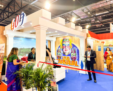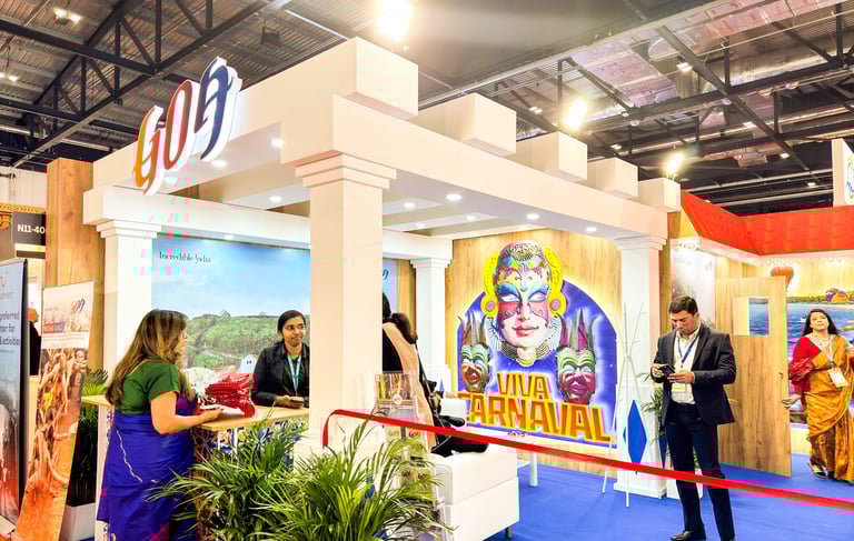 Bringing the Spirit of Goa to London — our vibrant exhibition stand at ExCeL London featured grand white pillars, colourful prints, and bespoke furniture inspired by Goa’s sun-soaked beaches, Portuguese heritage, and lively culture, creating a true coastal escape on the exhibition floor.