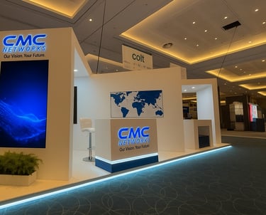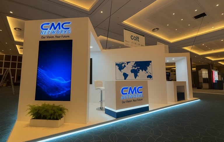 A Modern Showcase for CMC Networks at the O2 InterContinental — a sleek, contemporary stand featuring large-format screens, bold wall graphics, and refined furniture, perfectly reflecting the brand’s innovation and global connectivity.